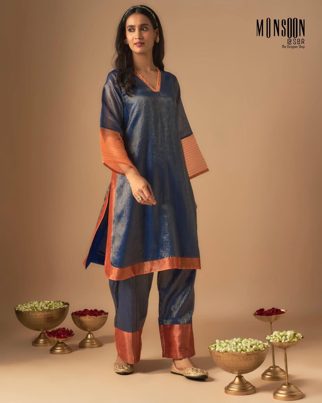 Striped silk kurta with copper accents
